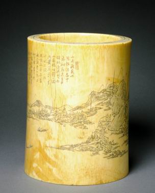 象牙刻山水筆筒,明,高13.5cm,筒徑10.6cm。