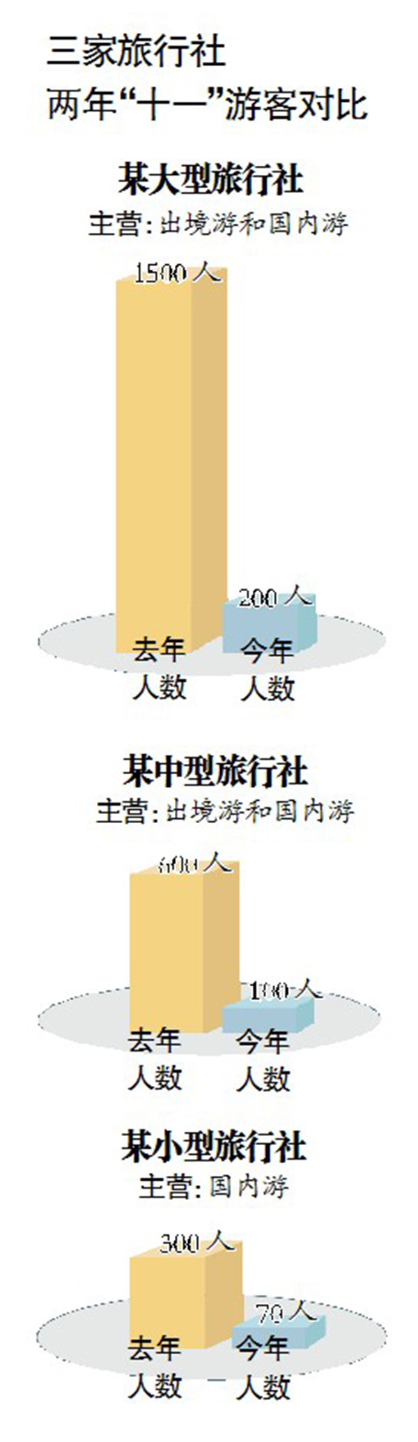 在哈市一家大型旅行社,一上午沒(méi)有一個(gè)人來(lái)報(bào)名。經(jīng)理不無(wú)感慨地說(shuō):“‘十一'市場(chǎng)就像今天的天氣一樣,‘冷冷清清'!